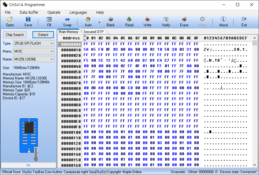 왼쪽 사이드바에 있는 Detect 버튼을 눌러서 연결한 롬 칩을 감지한다.