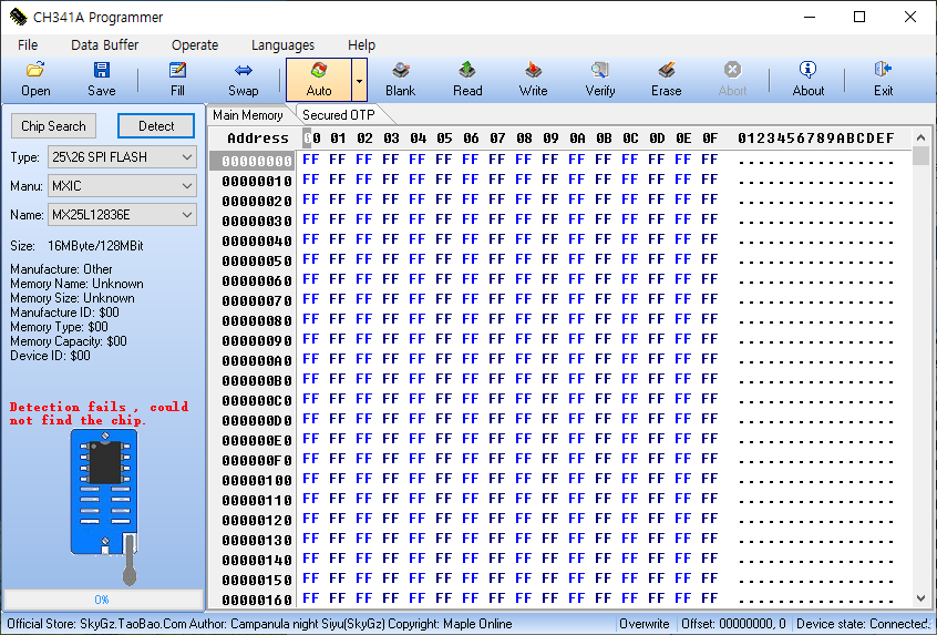 왼쪽 사이드바에 있는 Detect 버튼을 눌러서 연결한 롬 칩을 감지한다.