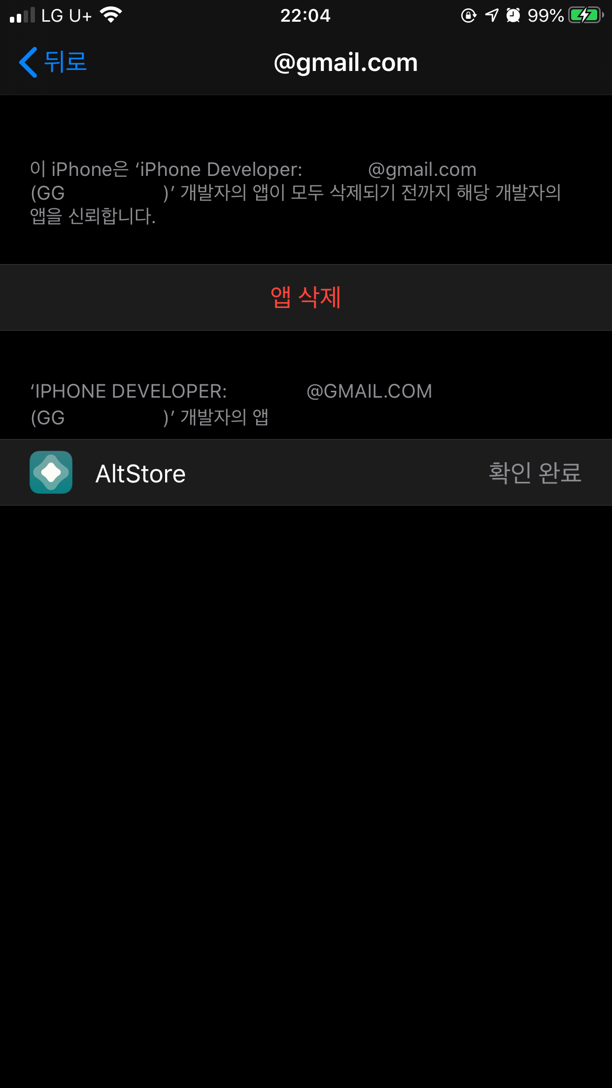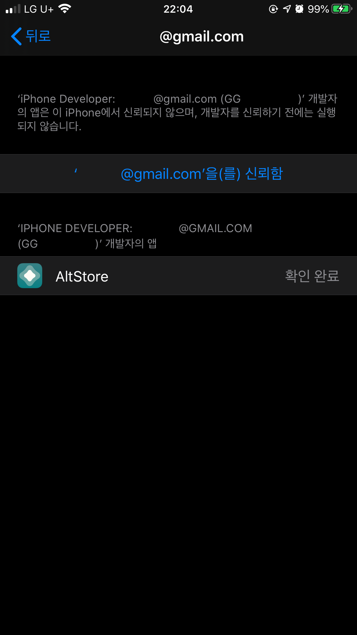 신뢰함을 눌러 설치한 앱을 신뢰시켜주면 우측 사진처럼 해당 개발자의 앱을 신뢰한다고 나온다.