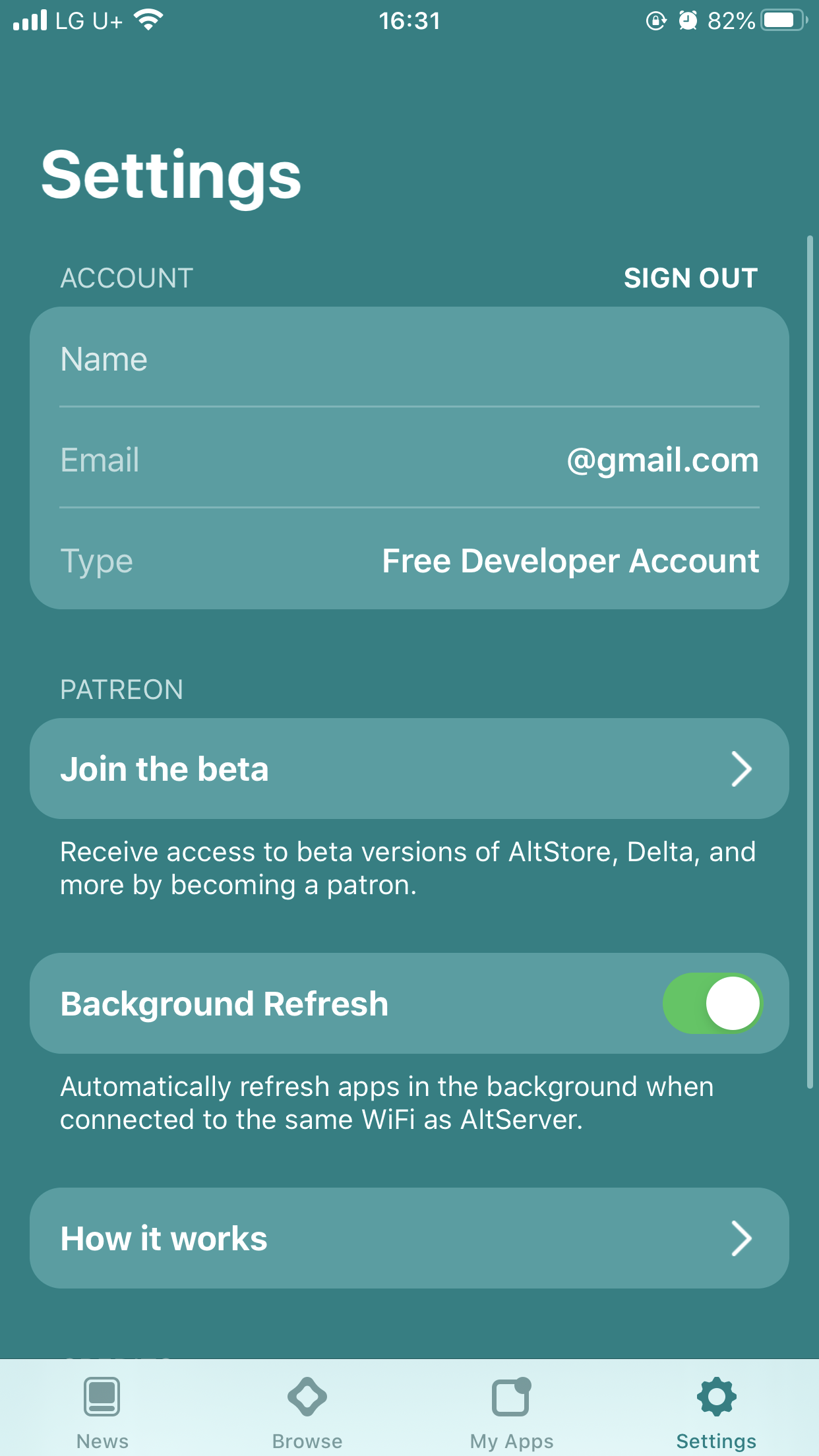 Apple ID로 로그인하고 설정에 들어가서 우측 사진처럼 나오면 AltStore의 설정이 완료된 것이다.