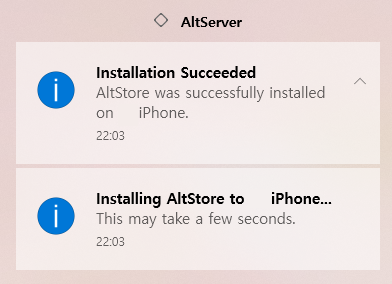 PC에서 좌측과 같은 알림이 뜰 경우 정상적으로 설치된 것이고 우측처럼 기기에 AltStore가 설치된 것을 확인할 수 있다.