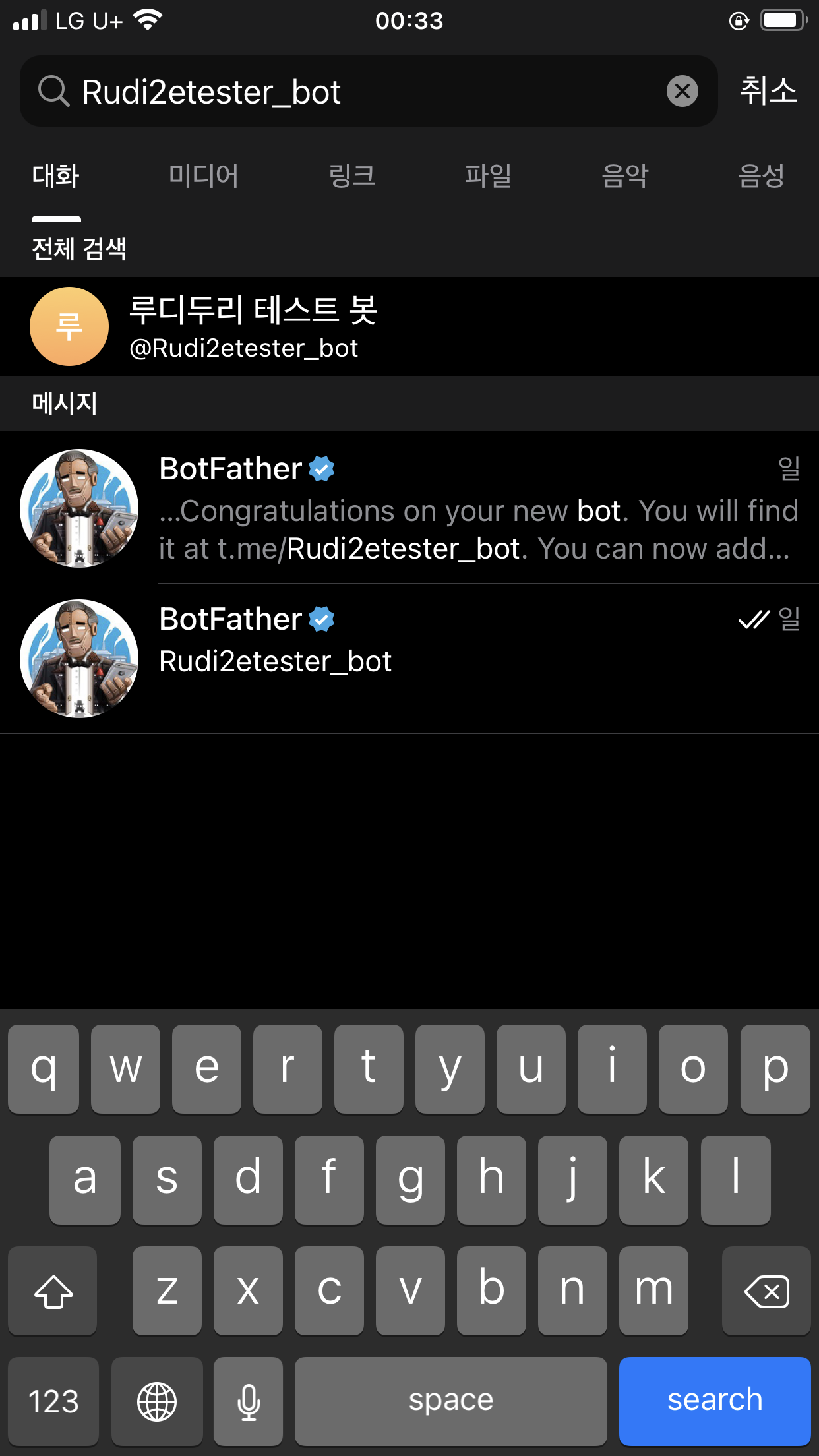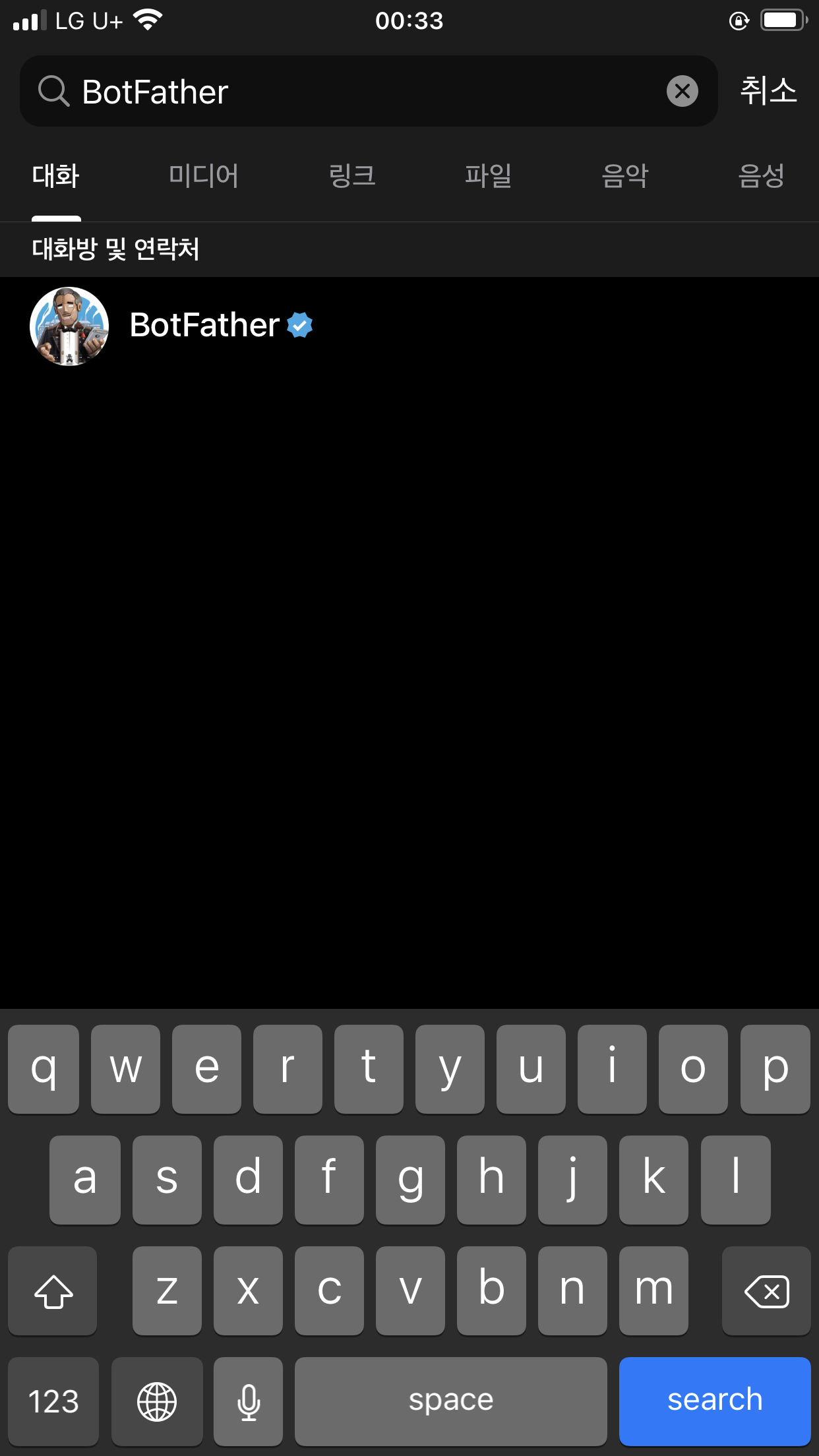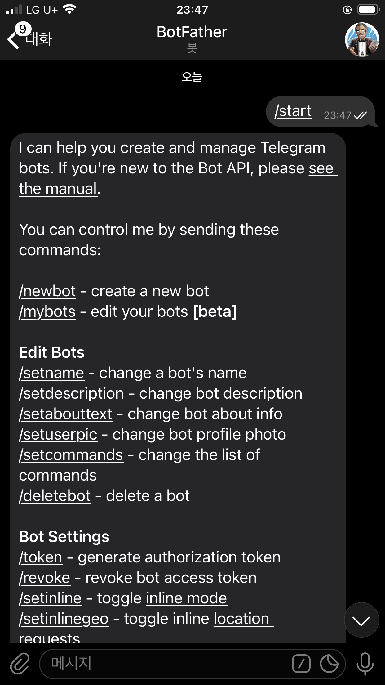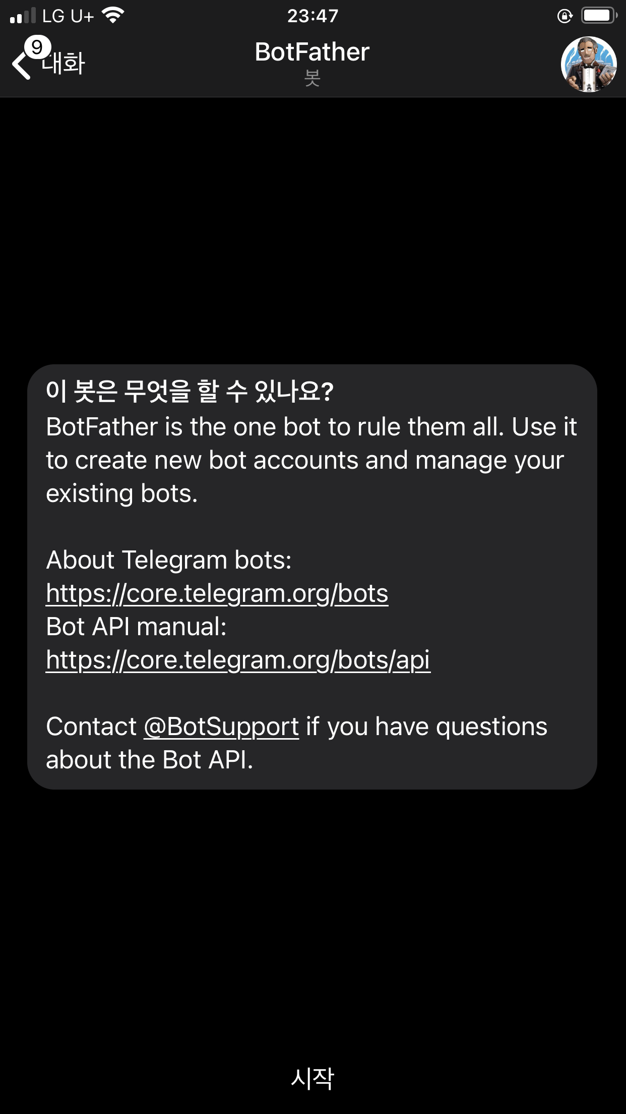 텔레그램에서 검색을 통해 BotFather를 검색하고 입장한 뒤 시작을 누른다.