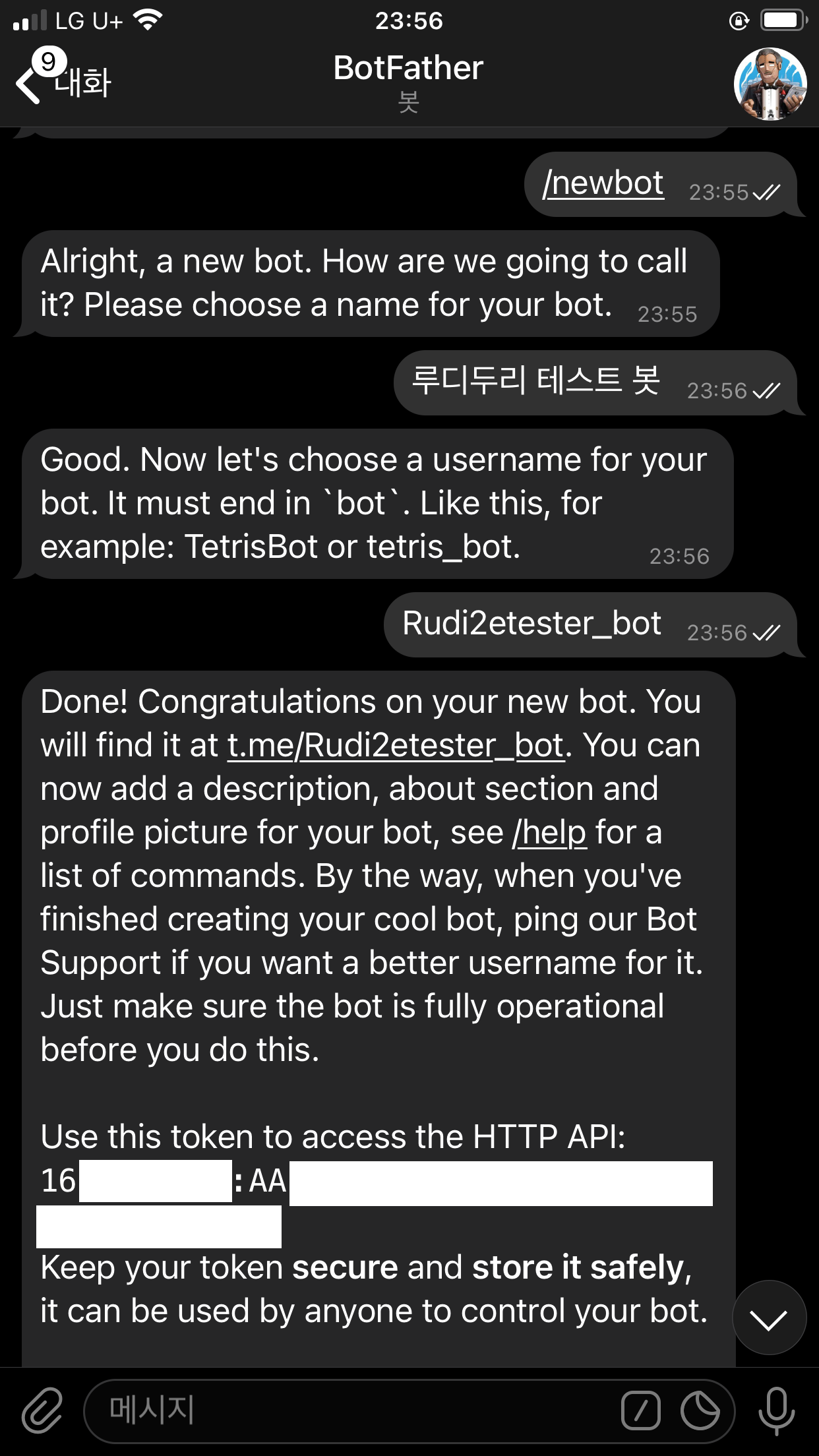 /newbot을 누른 다음 봇이 사용할 이름과 아이디를 입력해서 API Token 값이 뜨면 정상적으로 봇이 생성된 것이다.